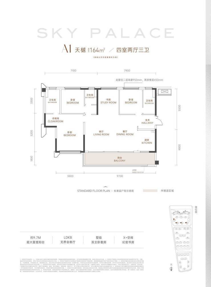 A1 – 天樾(建面约164㎡ 四室两厅三卫)?约9.7M超奢阳台,极致观景视野?LDKB一体化会客厅,社交、聚会生活场?墅级双主卧套房,尽显主人生活品位?独立灵动书房空间,栖息身心的理想国