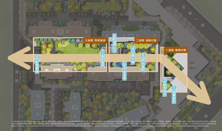 [海派式尊享园林,一轴三院八景]:约220m礼序贵轴贯通东西,三进礼序重构归家美学,八处特色微度假体验观景点。