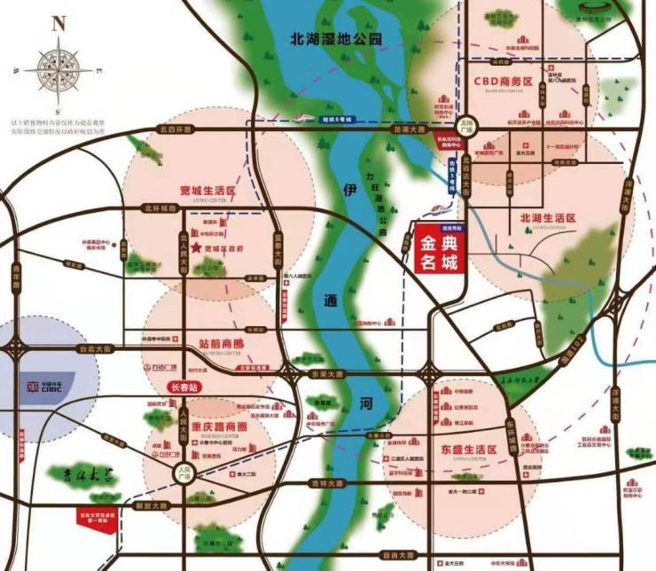 【周边配套】:伊通河,力旺湿地公园,长春北湖国家湿地公园,规划中的东新开河公园