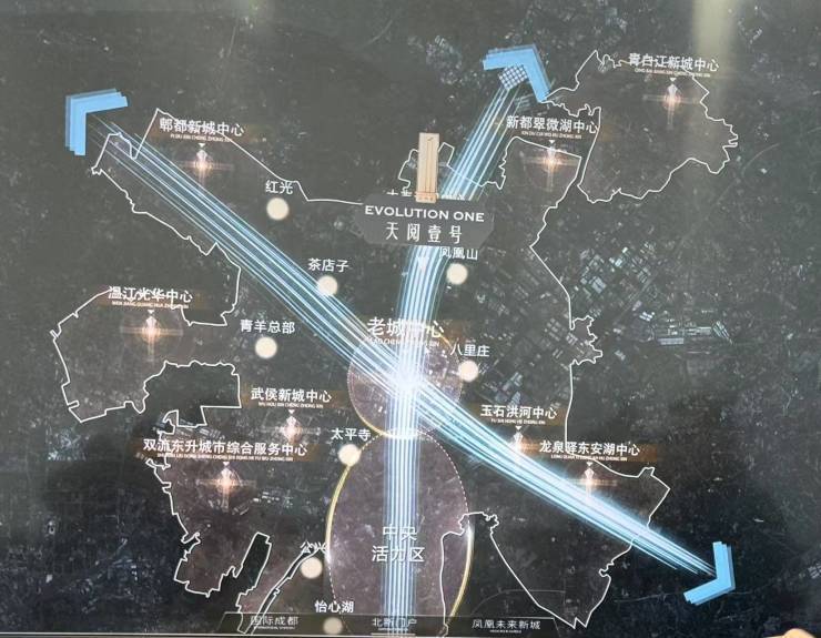 1:成都北中轴三环边,以天府广场为中心对折城南金融城,凤凰新城桥头堡