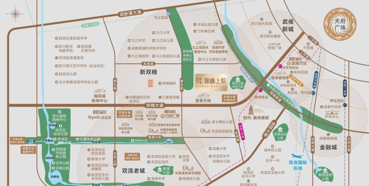 空港兴城锦楠上院雄踞双流新双楠核心板块,扼守双楠大道发展主轴,北接武侯新城、东连金融城、南邻空港经济区,承接主城高端改善外溢需求,是城南公认的低密宜居价值高地。区域作为成都环城生态带首批未来公园社区示范区,城市界面纯粹、居住氛围浓厚,土地稀缺性与板块发展潜力双重领跑。