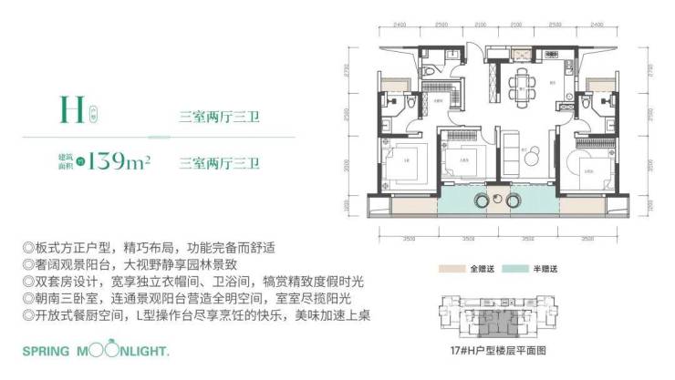 ▽H户型/ 建筑面积约139㎡ 三室两厅三卫