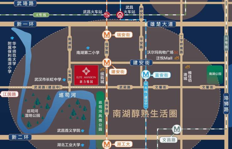 有华中师范大学附属保利南湖小学(872米)南湖第一小学(775米)永安小学(790米)武昌实验小学(842米)长虹中学,南湖中学,武南学校就在项目正对面
