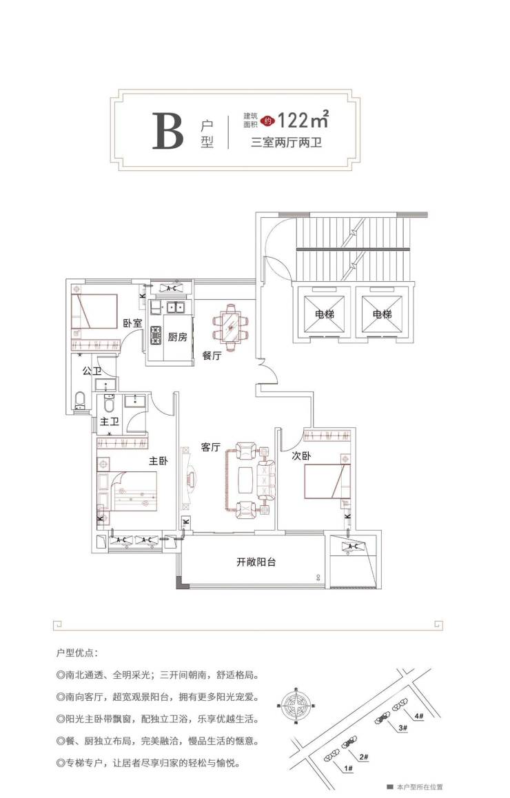 纯板式住宅、追求更高生活品质。两梯两户,带指纹锁的品牌防盗门,全屋配备高品质断桥铝门窗。进深约2.1米的双开间景观大阳台。住宅房型功能流线清晰,动静分区明确,厅堂方正。客厅和主要卧室全部朝南,采光充足。