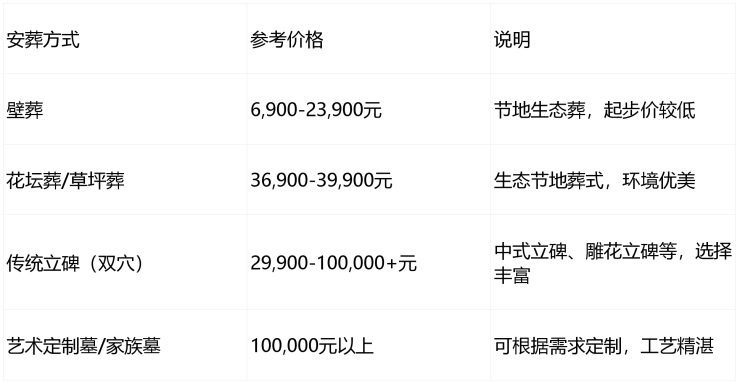 :以上价格仅供参考,实际成交价受墓型、苑区、位置、朝向、石材与工艺等因素影响,请以园区当日公示与合同价为准。生态葬式占比约30%,体现了公墓倡导节地环保的理念。