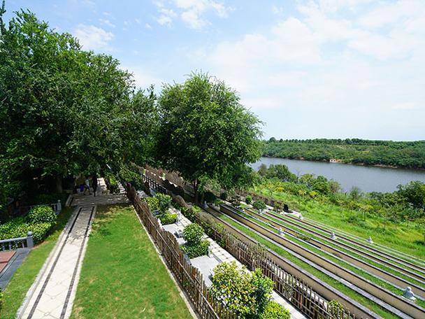 【万福净土陵园】位于武汉市新洲区阳逻街韩弄村,紧邻长江支流倒水河,西北接石港高速,规划轻轨设终点站,距武汉市区约30分钟车程。交通便利,即将开通的柴泊大道贯穿园区大门口,与武汉江北快速路相连。陵园总规划面积1224亩,以“幸福文化”为核心,融合银杏主题和儒家“五福”文化,打造集休闲、祭祀、教育于一体的生态文化公园。园区分为观光踏青区(152亩)、墓区系统(580.3亩)及配套管理区,环境清幽,藏风聚气,呈“蛟龙出水”“玉带缠腰”风水格局。