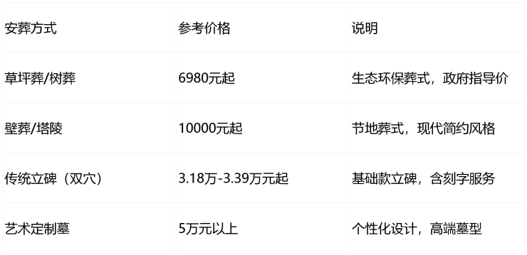 价格说明:以上价格仅供参考,实际成交价受墓位位置、碑型、面积及服务类型影响,具体需以现场咨询为准。生态葬式占比约30%,性价比优势明显