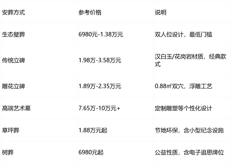价格说明:以上价格仅供参考,实际成交价受墓位位置(临山/临水/主山面)、碑材(汉白玉/花岗岩等)、工艺复杂度与后续管理标准影响,请以园区当日公示与合同为准。