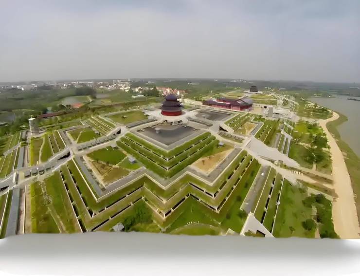 3、、建筑风格: 园区内有很多宏大的仿古建筑,如仿北京天坛的“地宫”建筑群(高30-40米)、仿唐代大明宫的祭祀中心,以及19米高的四面观音像。