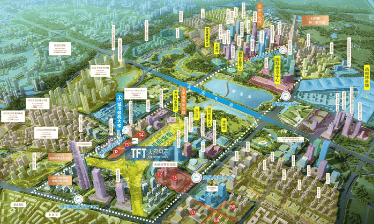成都未来的发展重心,位于天府新区的核心地带;天府中芯是占地8.5平方公里的超级中心,融合了五大功能中心。