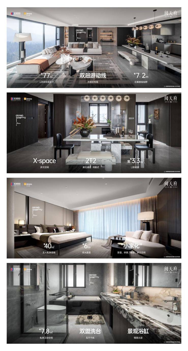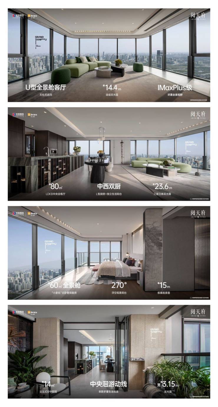 【项 目】——阅天府——新⼀代端厅领阅者华发股份与华润置地,落子天府黄金奢心,打造约143亩天西迭新大作,力邀六大国际大师团队操刀,以前所未见的迭创“全景舱”设计,筑写可穿越市场周期的作品,启序天府全新奢阶生活。