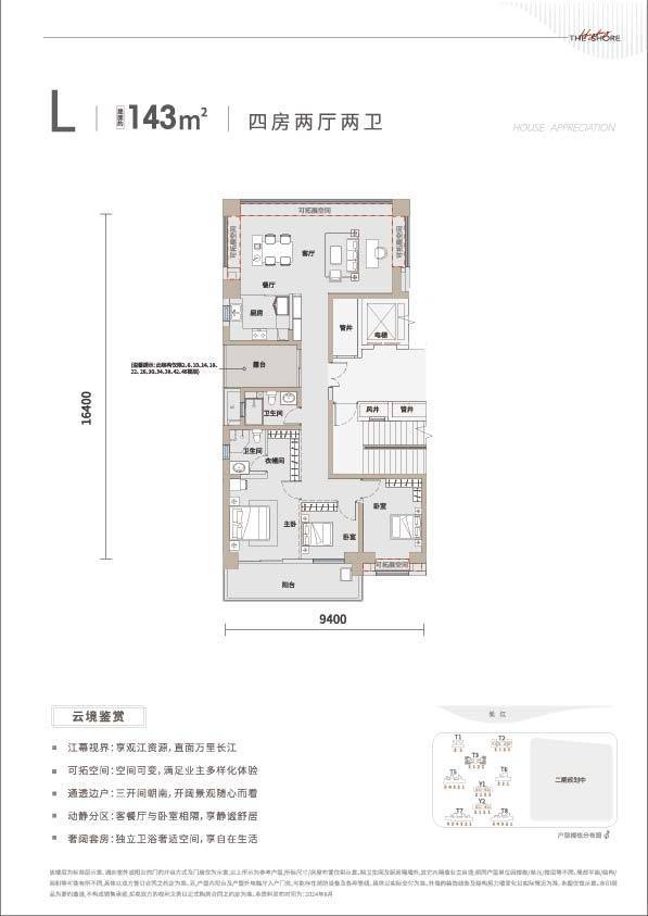 【巨幕阳台】:奢阔阳台尺度,IMAX景观面,尽揽四季风景【星级主卧】:主卧套房设计,独立卫浴与衣帽空间,起居从容