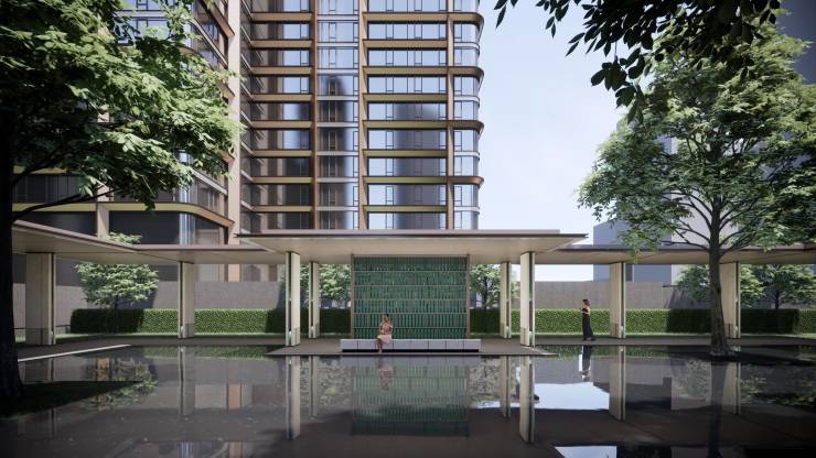 立体生态园林镜面水院倒影建筑美学,风雨连廊串联下沉庭院(叠泉绿台),园林即金融精英的第三会客厅。