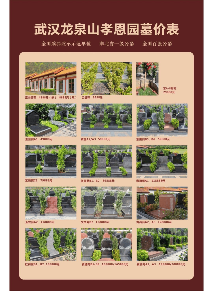 武汉龙泉山孝恩园公墓价格因类型、面积和位置而异,立碑最高22.8万,卧碑分9588元和1.98万两档,壁葬4288元最经济,草坪葬2.98万。价格随市场变化,购买前请咨询工作人员。