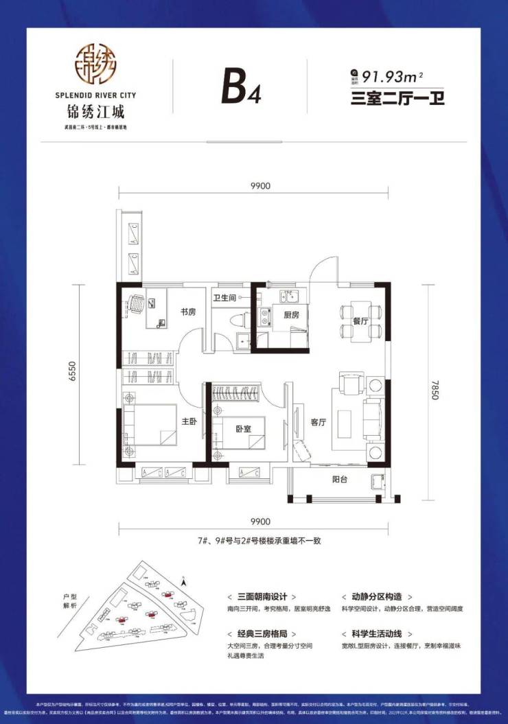 B4户型建面约92平,三房两厅一卫