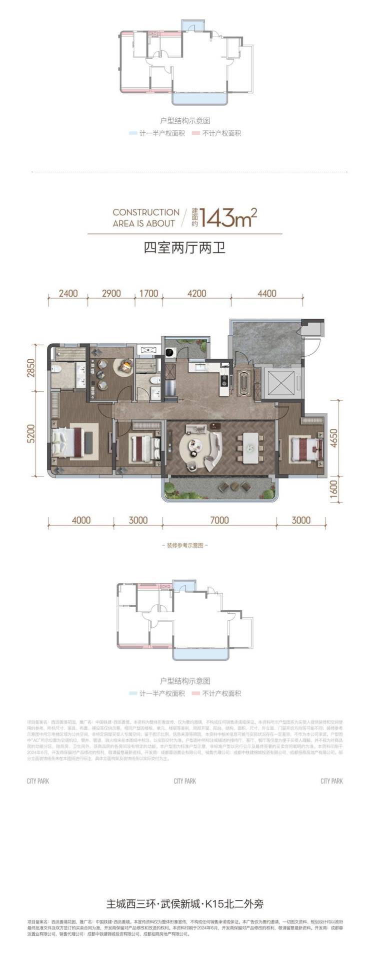 武侯新城王炸,建面约143㎡尊阔四房,揽约4.4米入户光厅、南北双阳台(配置开敞生活阳台)、约7米开间大横厅、约50+㎡超大LDKG客厅、南向四面宽,开间达到约17米。