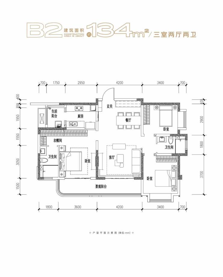 B2 建筑面积约134㎡ 三室两厅两卫