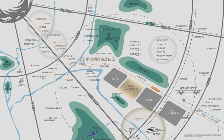 全维配套:四轨 TOD + 公园 + 商业 + 教育 + 医疗,全能生活即刻兑现