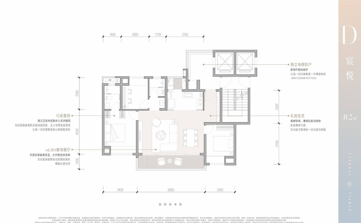 约6.8m奢阔横厅开间,开放式家庭核芯区,大尺度互动空间