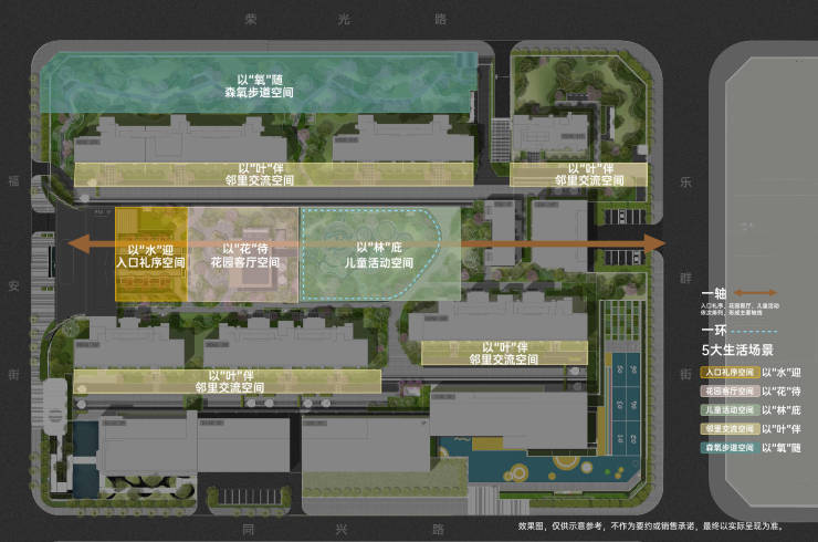 1、景观设计秉承“把森林进居住区”的理念,以安缦酒店式的生活场景,再现都市森林;2、“一轴一环五大活动空间”将自然元素融入景观,给予业主无限惊喜体验。