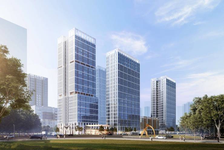 引鉴新加坡建筑理念,启幕城市窗格。外立面整体采用现代简约风格,以灰色、白色为主基调,大面积运用玻璃幕墙,呈现共建化立面高级感;部分外立面则以玻璃幕墙搭配石材、线条与建筑形成有意思的城市窗格,达到了一种丰富、有序、统一的姿态,形成强烈的品质感