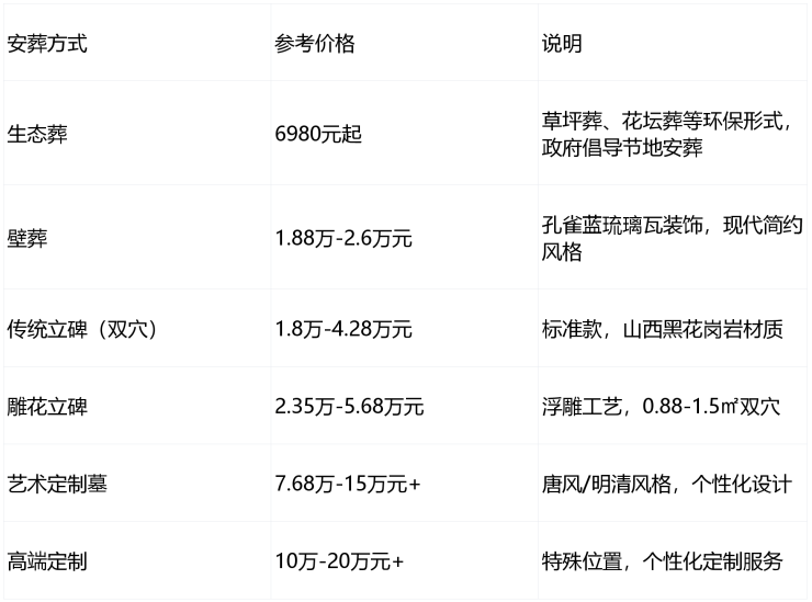 价格说明:以上价格仅供参考,实际成交价受墓型、苑区、位置、朝向、石材与工艺等因素影响,请以园区当日公示与合同价为准。