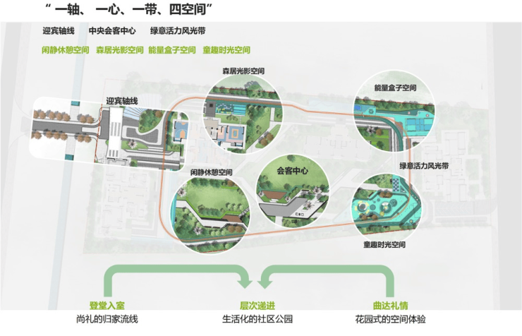 项目采用"一轴一心一带四空间"景观架构: