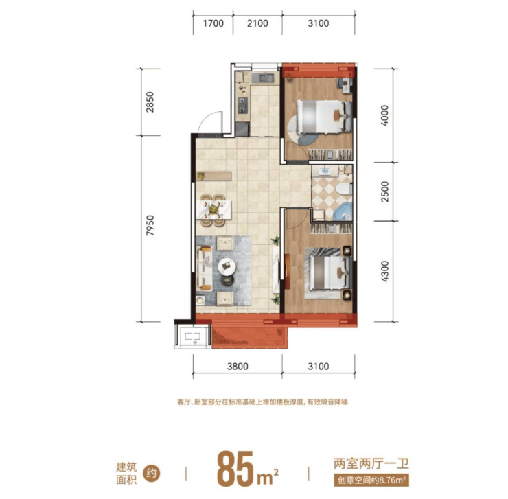 两室两厅一卫(客厅开间3.8米,卧室开间3.1米)厨房L型设计,赠送面积约"9"平