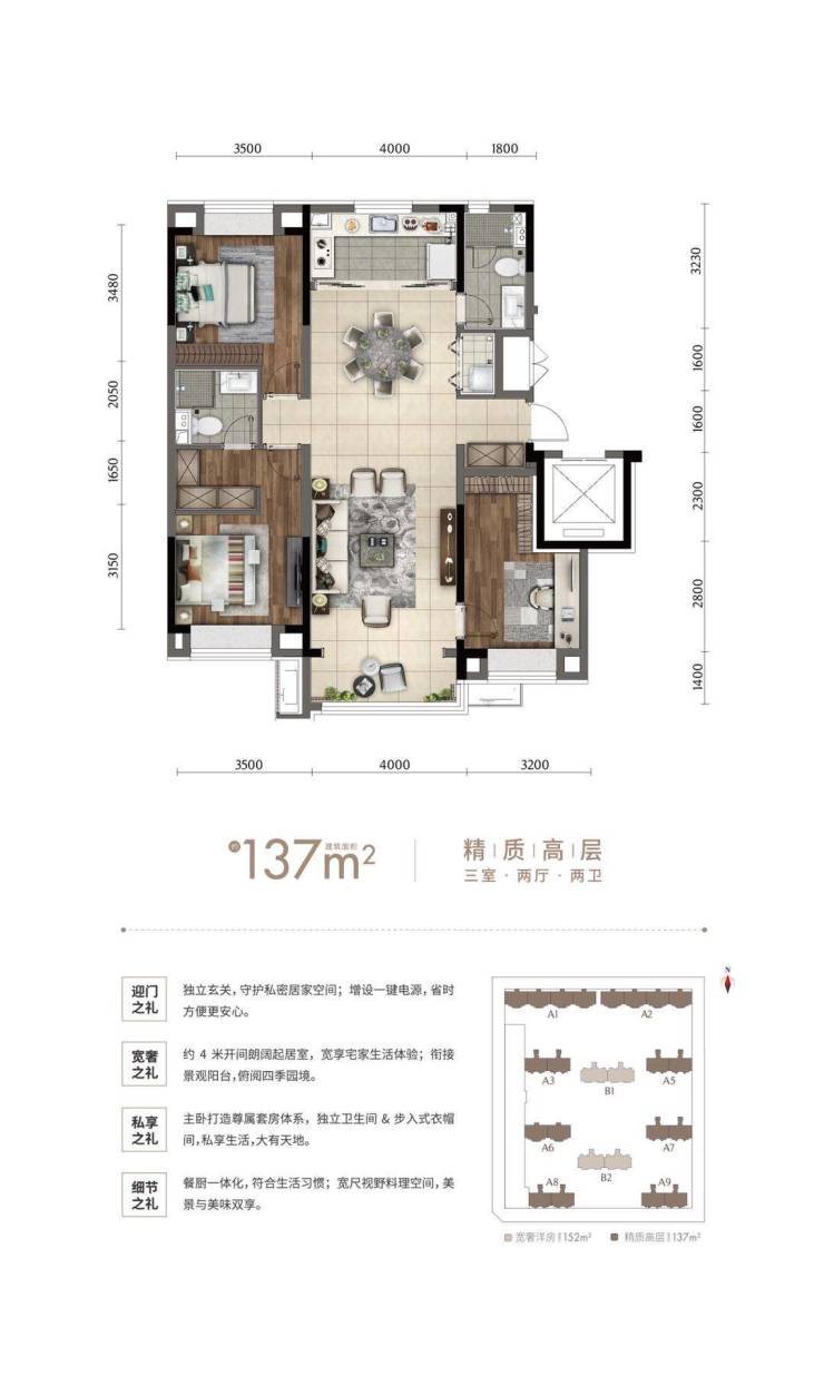 · 顺应当下改善置业潮声,园区仅两种户型纯粹规制排布· 建面约137-152㎡大三室宽平层,划定了圈层的纯粹性· 沿袭华润置地全新精装标准,打造润+品质新升级