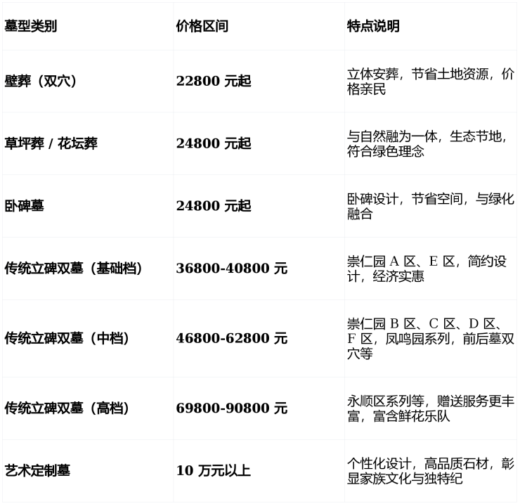 以上价格仅供参考,根据实际需求不同价格有所浮动,部分产品服务暂无,详情请拨打公墓电话咨询确认;