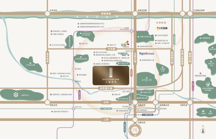 1:成都北中轴三环边,以天府广场为中心对折城南金融城,凤凰新城桥头堡