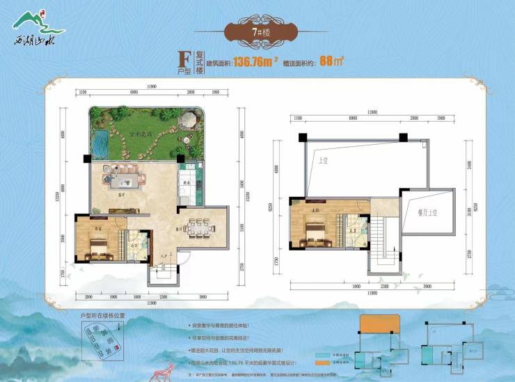 项 目 占地面积约50 亩 ,共由9 栋 18 层洋楼组成 ,均为第四代户型建筑,户型面积从 62 平精致两房到139 平豪华复式 ,也是安顺唯一房屋套内面积再做赠送的小区。西湖山水项目容积率 2.5,绿化率35%,小区配套儿童游乐场、健身休闲区6000 平中庭打造优质高端生活园林小区 ,带您尊享生活的诗篇 ,与自然同频的美好。由政府倾力打造的花山绿道蜿蜒西湖山水而过 ,作为安顺唯一铁路主题山体生态公园 ,小区道路直通绿道 ,花山绿道也将成为您茶余饭后的又一去处。三、在售户型鉴赏