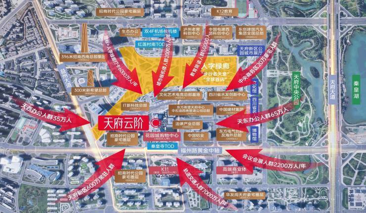 【成都天府智慧城—国家级产业集聚地】拥有500强企业28个,总部企业67个,约80万⾼端产业办公人群。这里还有以招商/中海/中交/中铁等头部央企为代表的最高能级综合产业园区。