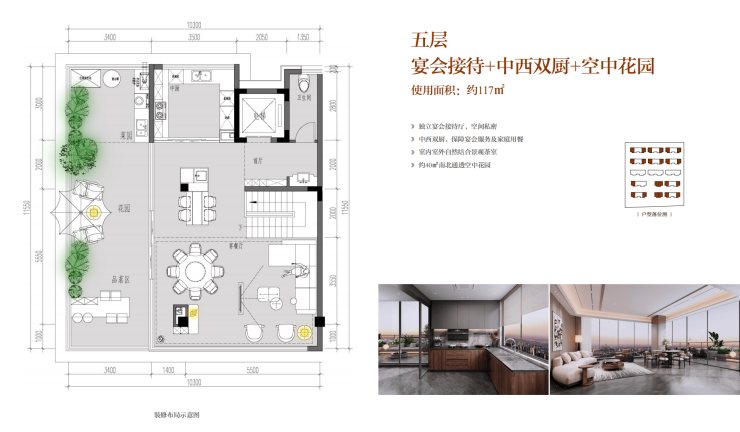 花园面积约57㎡(入户花园约17㎡+屋顶花园约40㎡)