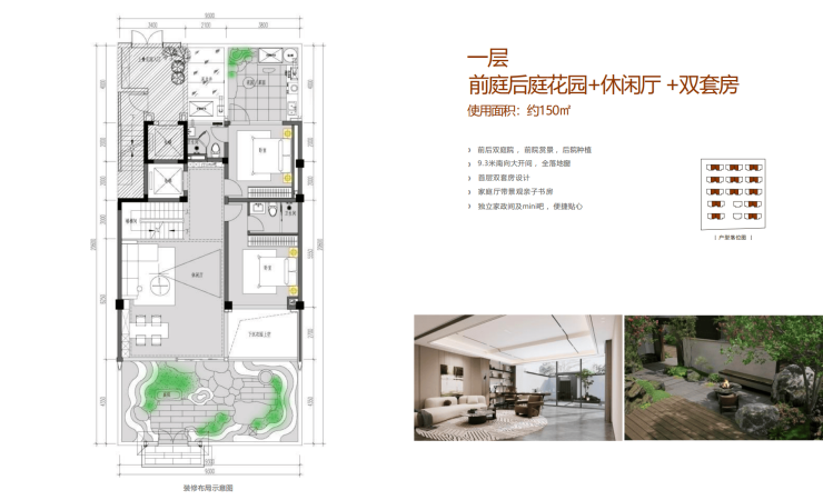 花园面积约90㎡(前厅花园约50㎡+下沉花园约26㎡+后庭花园约15㎡)