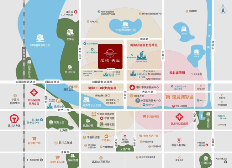 【医疗配套】向东南约7公里的自治区人民医院、向西南约9公里的银川市妇幼保健院阅海分院、向西约2公里可到达自治区工人疗养院、向南约4公里可到达宁夏阅海养老中心,专业齐全的医疗配套设备,缔造健康品质生活。