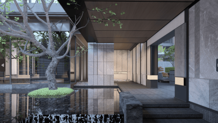 在约80米宽的门庭入口,直接开启的大隐于世的隐奢儫门格调。多种奢石奢材的铺装,以造型纹理结合匠心工艺,营造出肉眼可见的隐奢质感与幽静氛围。大面积爱马仕宝石系大理石镶入冷峻灰不锈钢包边组成的景墙,低调但又质感十足。入口两侧由沉稳灰色大理石到白色冰裂纹陶板墙面,由石头到陶片,象征着渐入佳境,风雅自生。两侧对称而立的造景松,都是从泰山整株移植而来。