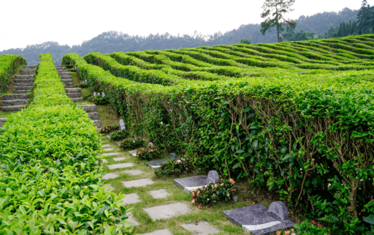茶园葬:墓碑隐于百亩茶田间,仅露出小型艺术碑,春采茶、秋赏叶,四季皆景。