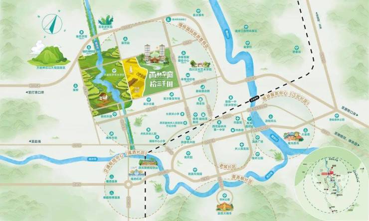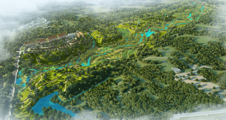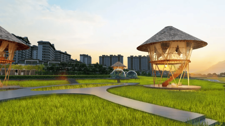 稻梦傣乡——南侧约1280亩田园综合体(建设中),稻田实景剧场、稻田艺术咖啡馆、稻田主题乐园、稻田漂流、稻田栈道、溪地雨林等设施,成就项目约1公里视野大屏。