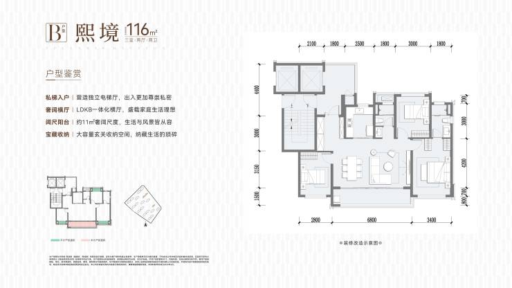116㎡三居:动静分区,主卧套房,U型厨房
