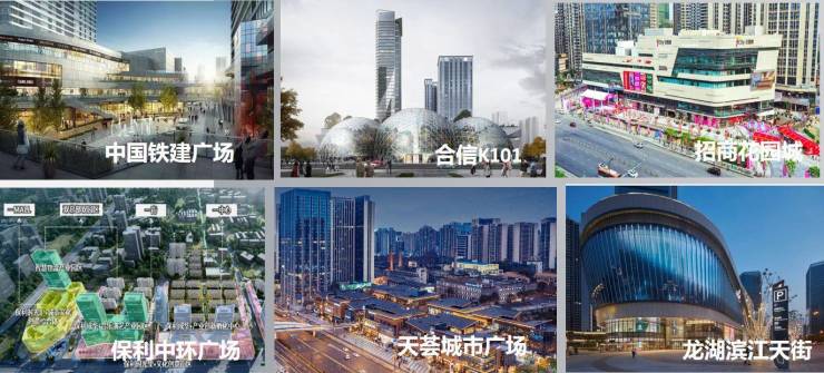 东郊记忆,建设路,万象城,龙湖三千集、伊藤洋华堂、王府井discovery、SM广场、万科天荟、龙湖滨江天街、万象城。
