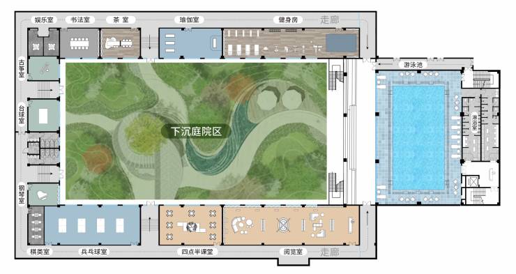 【全家人的高配逸趣主场】近2000㎡围合式下沉庭院,配建恒温泳池、下沉花园,邂逅三代人的休闲日常。健身房、瑜伽室、茶室、书法室、古筝室、钢琴室、乒乓球室、四点半学堂、阅览室等全龄功能社交场,会客闲适,涵养身心。